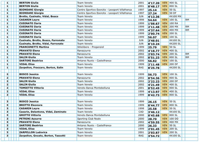 Tutte le medaglie venete del settore femminile
