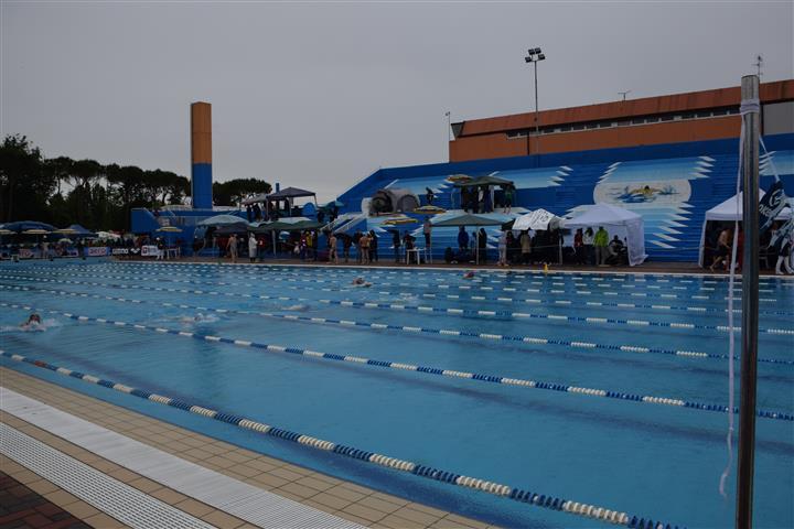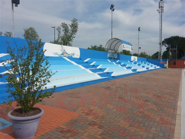 Il complesso è dotato di tribune per 1200 posti, ampio solarium a bordo vasca, area verde di 7000 mq con estese zone ombreggiate da pini marittimi, olmi, tigli.